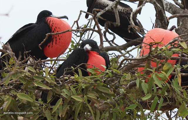 Unlike the boobies who like to walk around and nest on the ground, the frigatebirds prefer to hang around in the trees.